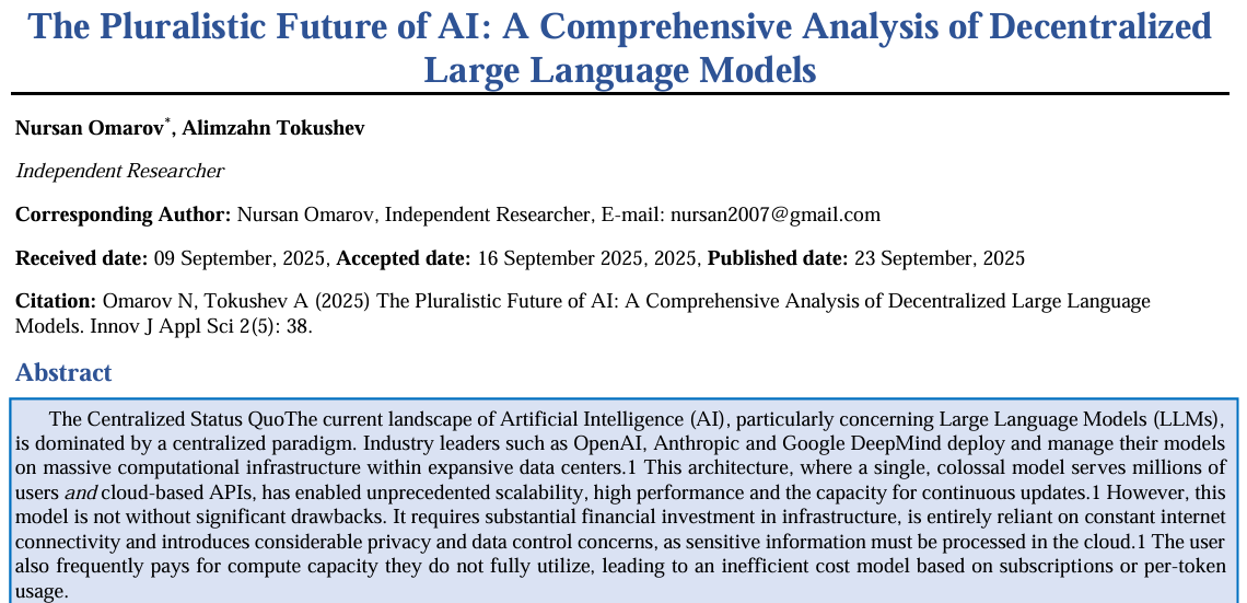 The Centralized Status QuoThe current landscape of Artificial Intelligence (AI), particularly concerning Large Language Models (LLMs), is dominated by a centralized paradigm. Industry leaders such as OpenAI, Anthropic and Google DeepMind deploy and manage their models on massive computational infrastructure within expansive data centers. This architecture, where a single, colossal model serves millions of users and cloud-based APIs, has enabled unprecedented scalability, high performance and the capacity for continuous updates. However, this model is not without significant drawbacks. It requires substantial financial investment in infrastructure, is entirely reliant on constant internet connectivity and introduces considerable privacy and data control concerns, as sensitive information must be processed in the cloud. The user also frequently pays for compute capacity they do not fully utilize, leading to an inefficient cost model based on subscriptions or per-token usage.